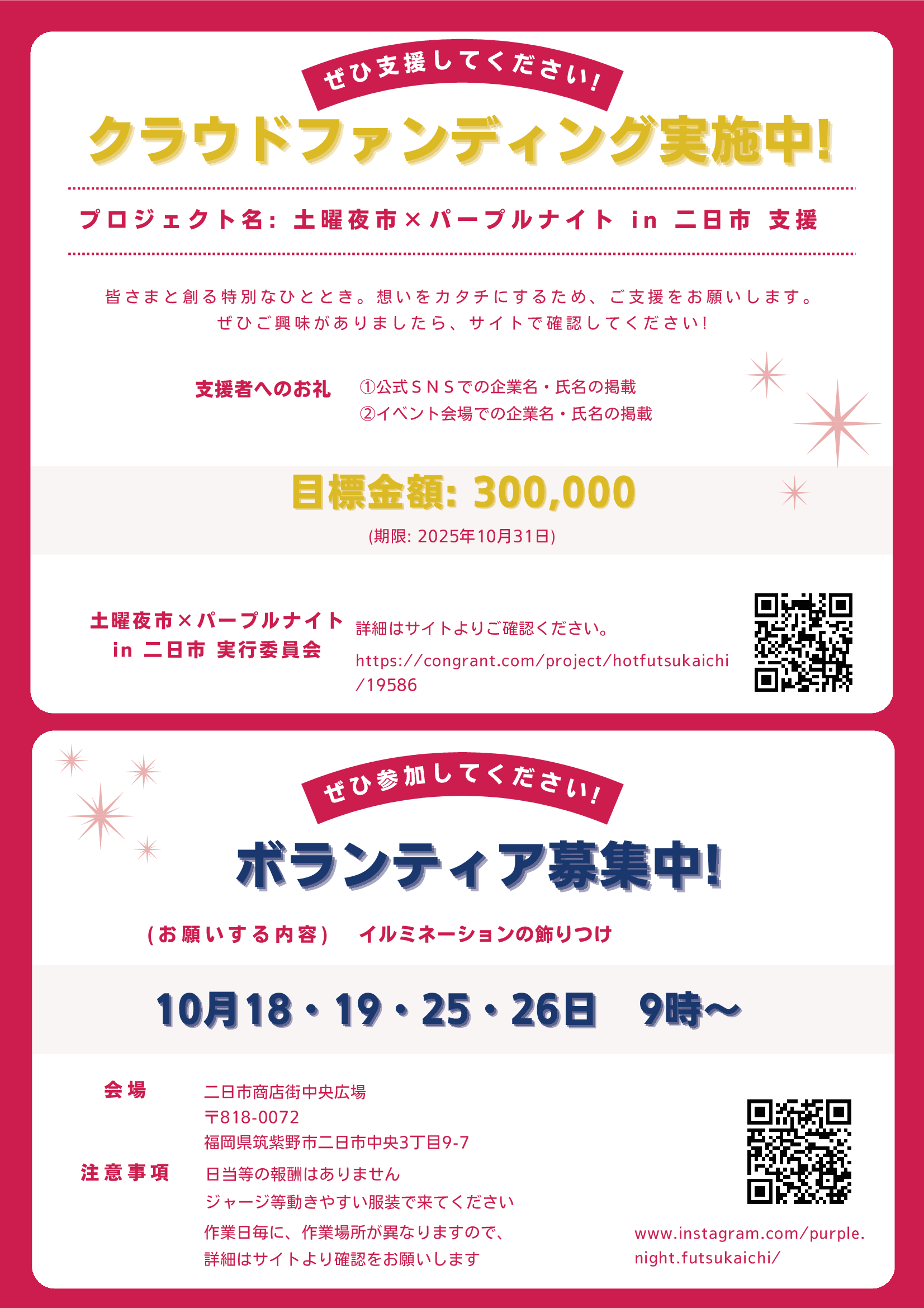 ![]() 土曜夜市×パープルナイトin二日市 https://www.instagram.com/purple.night.futsukaichi/ クラウドファンディング実施中です |